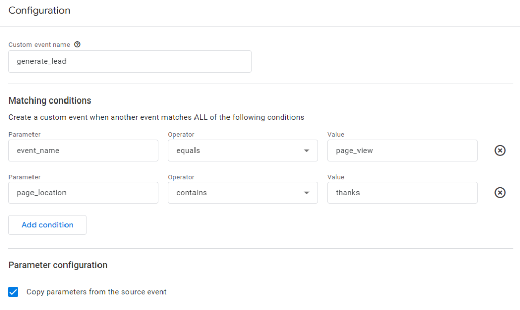 A classic example is if someone has just had a page_view event of a thankyou page (ie. the page_location parameter contains “thanks” or something similar), then you can fire a conversion event like generate_lead. Note that this is pretty easy and you can then define that event as a Key Event in GA4 and import it as a conversion into Google Ads. Here’s an example of what this would look like: