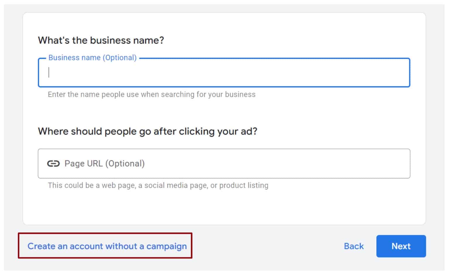 Google tries to wizard the owner into creating a campaign at the end, this should be skipped by switching to expert mode (bottom of the screen):