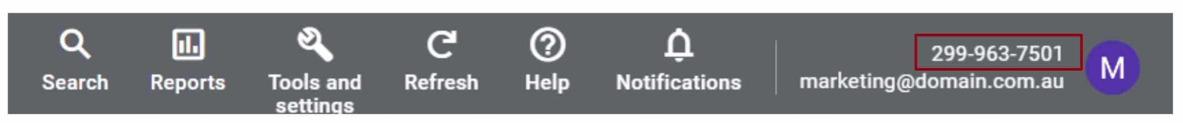 Your advertising partner needs your account ID to issue an invite to your account. This 10 digit number can be found on the top-right of the screen next to your login. You can select and copy the ID directly and send it to your agency or other third parties that you want to give access to.
