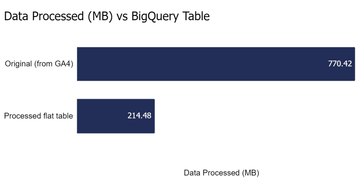 • By storing events as a flat table, you’re doubling your storage. This shouldn’t be an issue for most organisations, but you could even look at deleting old GA4 tables from the original format as a process.
