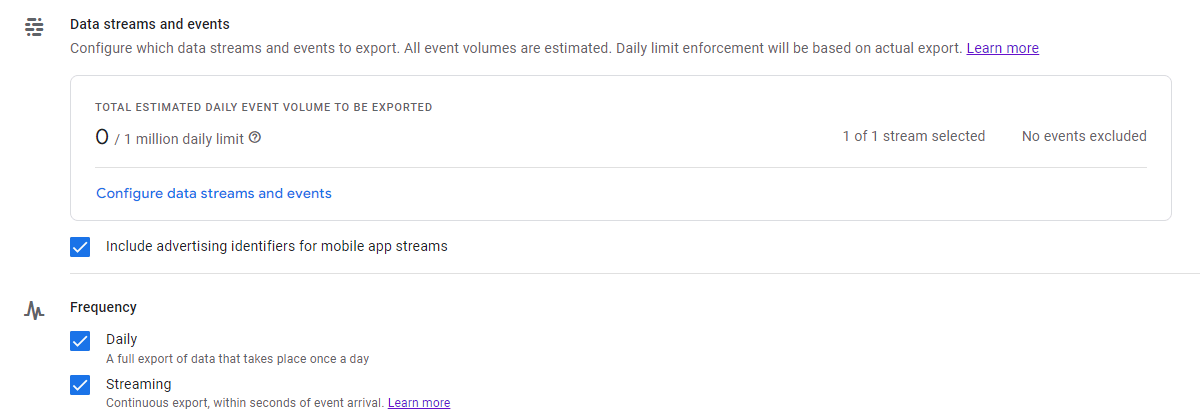 One of the best features of GA4 is that the BigQuery export of the raw data is available for free. For the first time, this allows organisations of all sizes and budgets to perform detailed or advanced reporting and analysis on their website traffic data. You can set this up in GA4 under BigQuery linking: