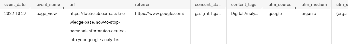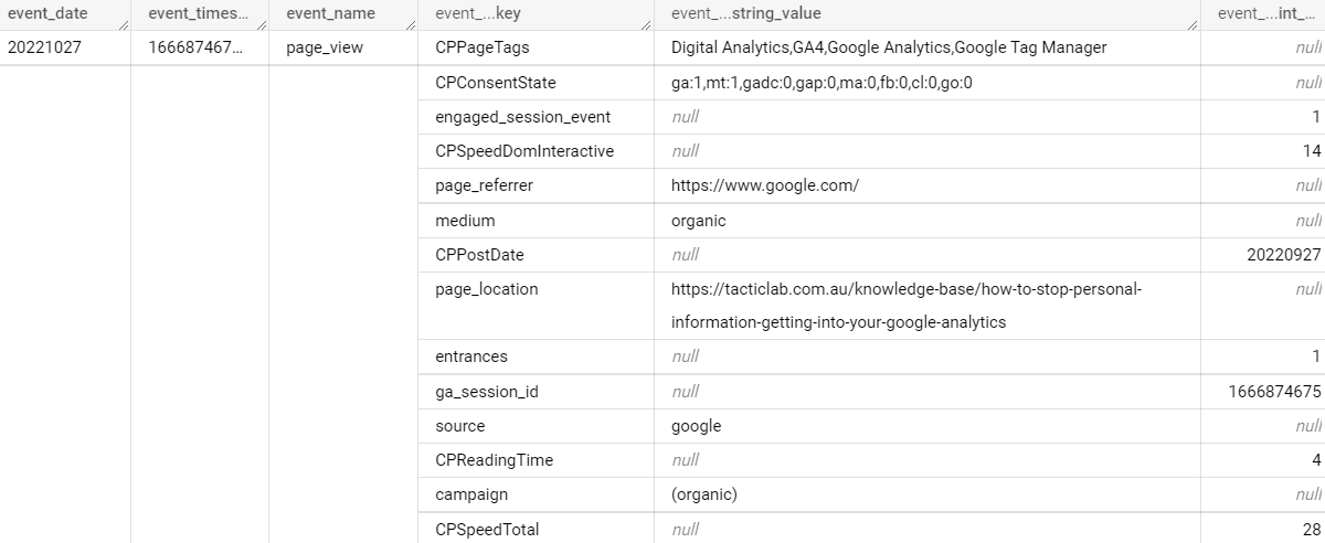 What you see above is part of a single row of data, an event on the Tactic Lab website. The sub-rows like source, entrances and page_referrer are repeated records and come from the parameters you send to GA4. This is a flexible model as you can add more parameters and it still works. But this setup means you can’t address those fields directly in SQL, but will need a subquery with an unnest statement. For example, here’s how to find the top 10 URLs by pageviews for a given day: